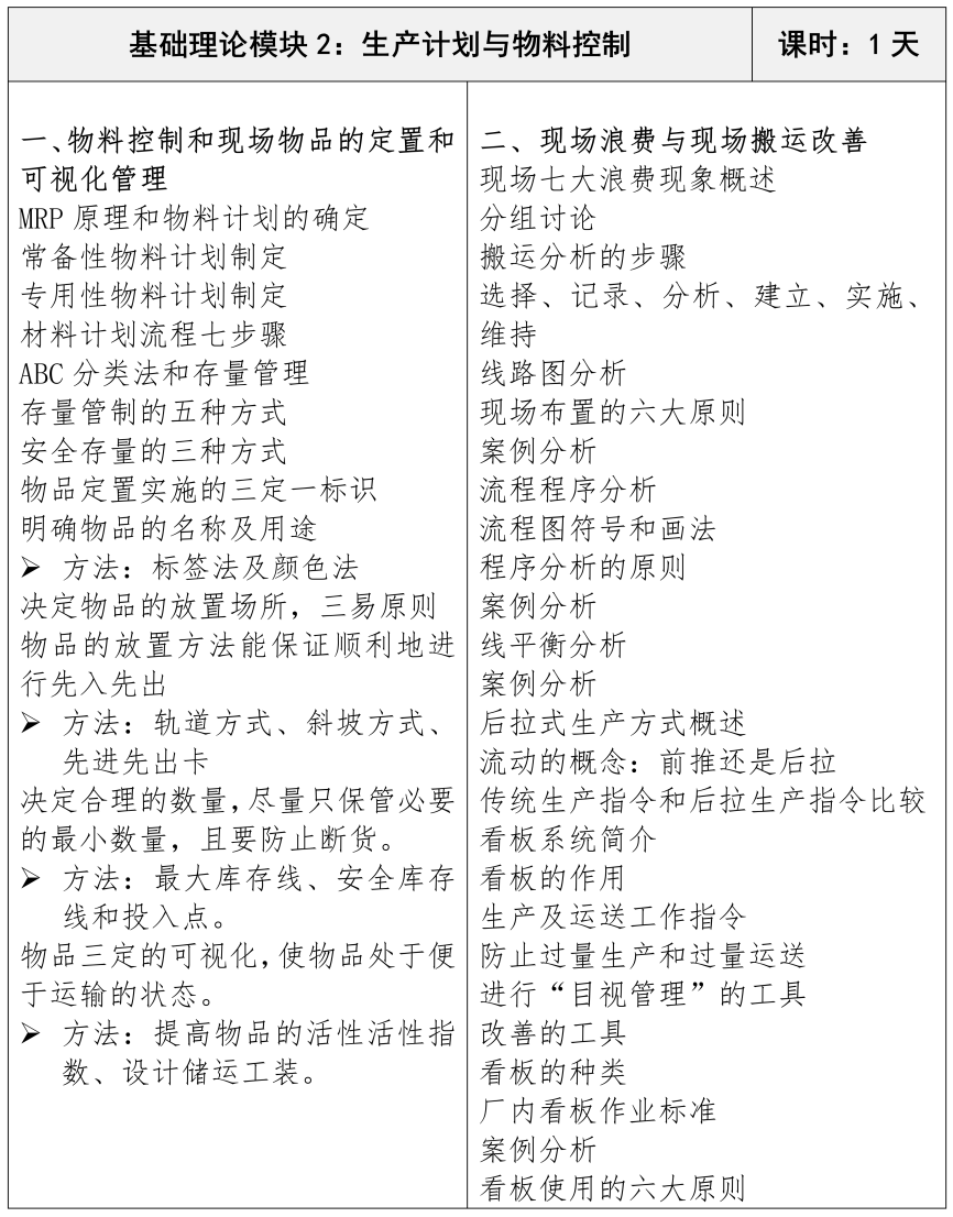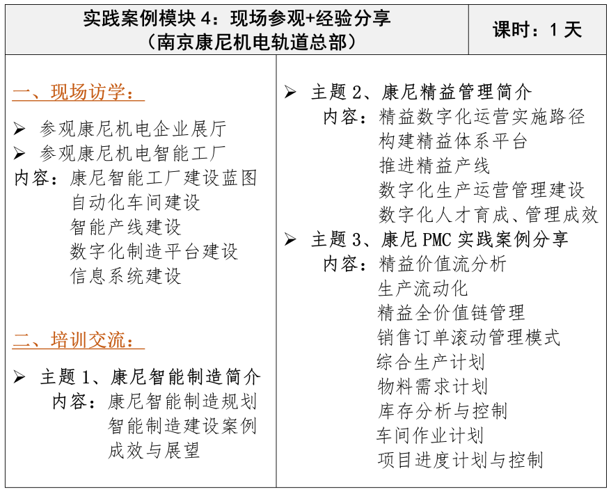 教學周期3天,其中2天1晚理論講授+案例討論+實操演練、1天現場教學+標桿參訪。
