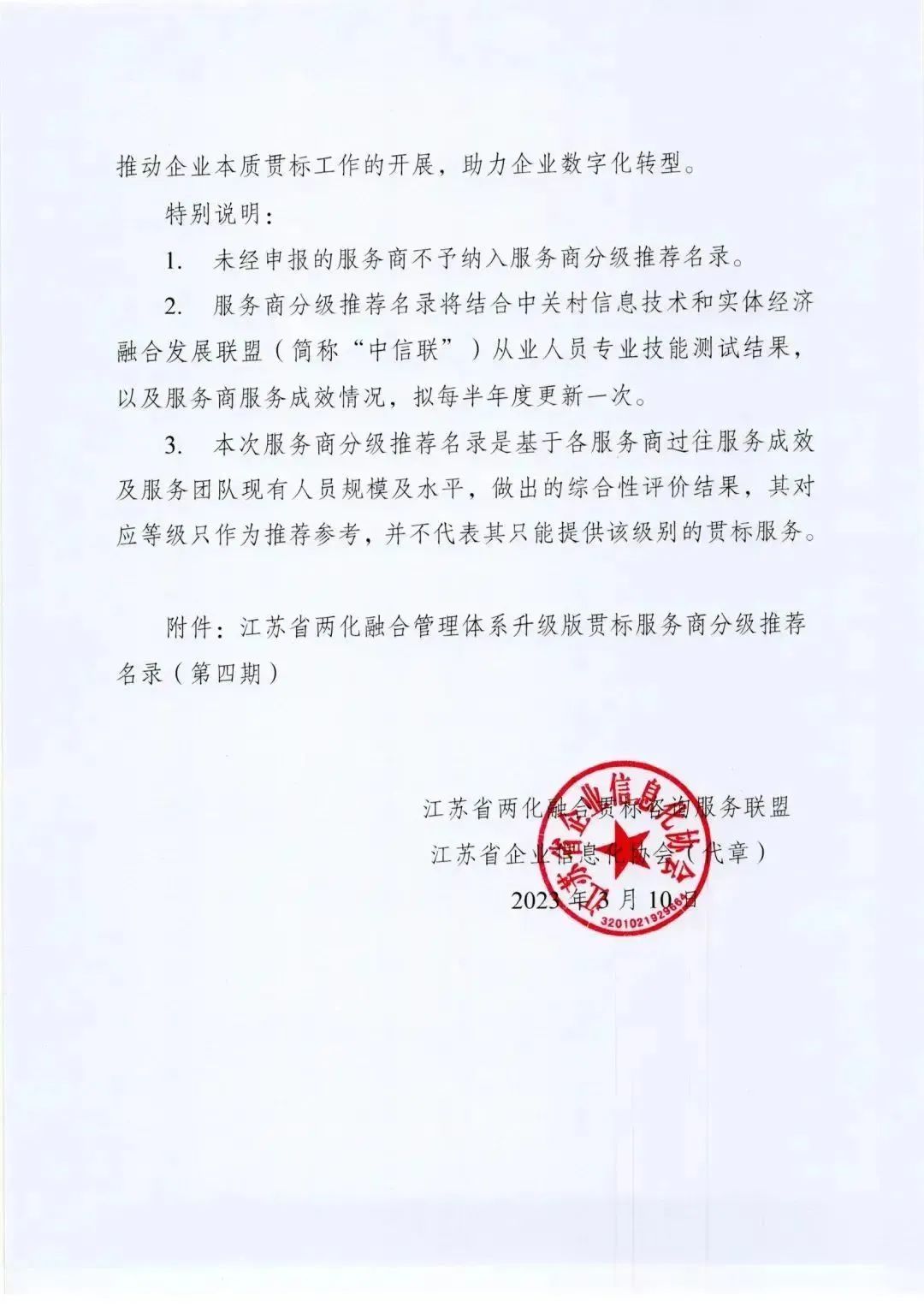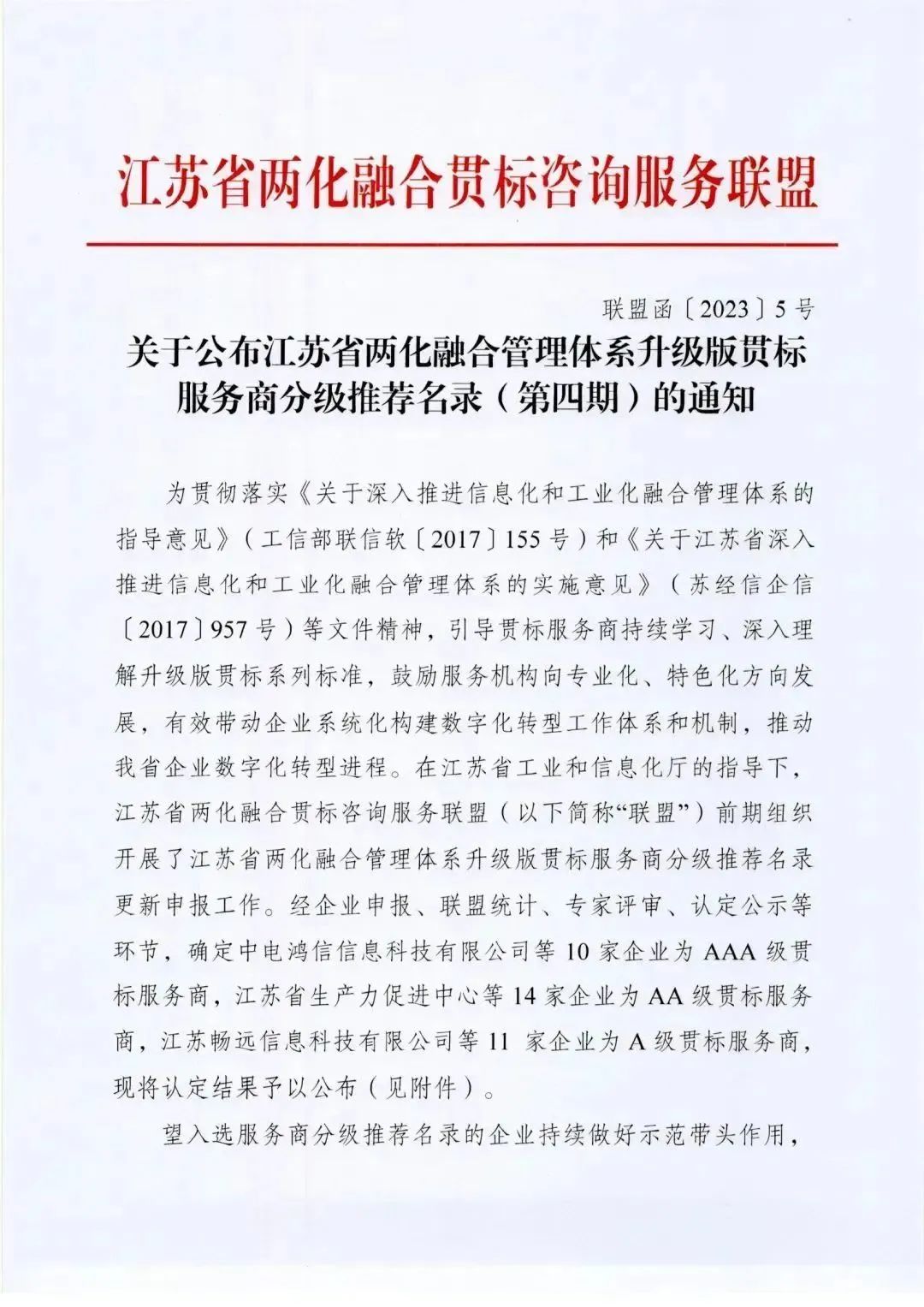 關于公布江蘇省兩化融合管理體系升級版貫標