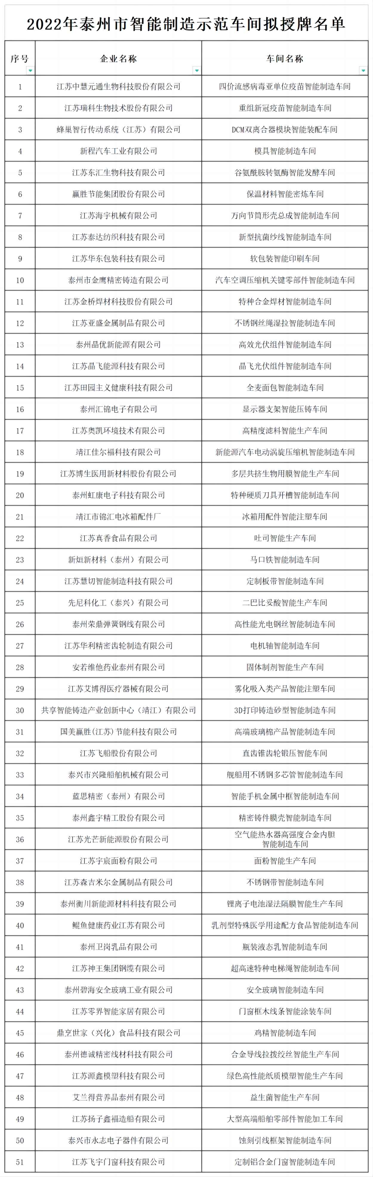 為鼓勵(lì)企業(yè)加大智能化改造投入力度,提升智能制造水平,根據(jù)《關(guān)于做好2022年市級(jí)智能制造示范車間申報(bào)工作的通知》(泰工信發(fā)〔2022〕109號(hào)),市工業(yè)和信息化局組織開展了2022年度市級(jí)智能制造示范車間認(rèn)定工作。經(jīng)企業(yè)申報(bào)、市(區(qū))推薦、形式審查、材料評(píng)審、現(xiàn)場(chǎng)核查、信用查詢等程序,擬對(duì)全市51家車間進(jìn)行授牌,現(xiàn)予公示。